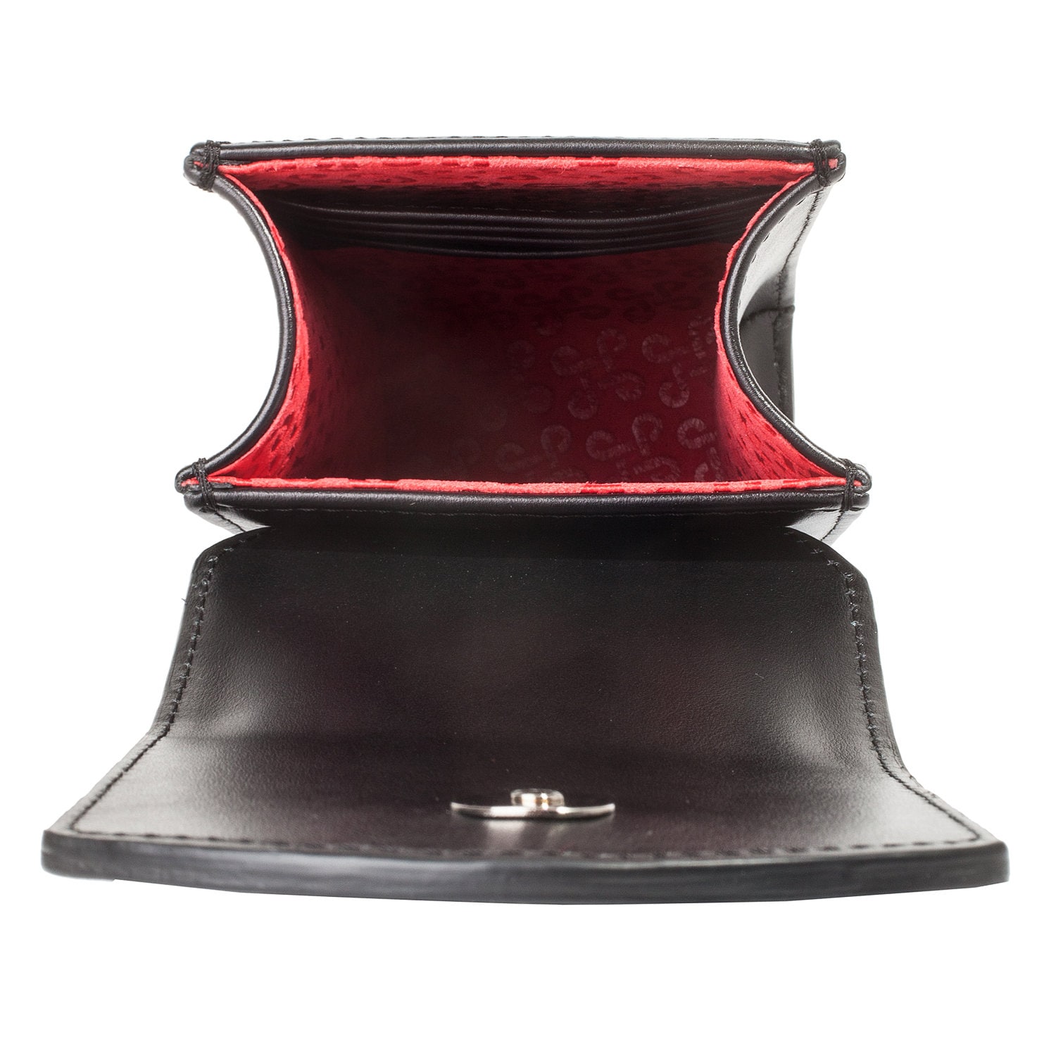 Black genuine leather woman crossbody bag from Ukrainian designer Katerina Fox. Fashionable and elegant modern bag KF for bright girls and women. This bag is able to attract attention and highlight your exquisite tastes. The internal space of a bag is equipped with one spacious compartment, four patch pockets for cards. The bag is closed on the button-magnet. The kit also includes a storage bag.