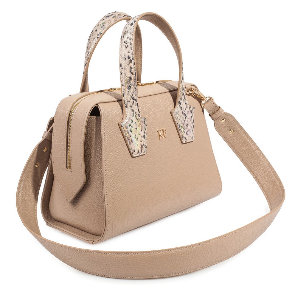 Beige genuine leather handbag from Ukrainian designer Katerina Fox. This model is designed for women who appreciate the sleek design combined with functionality and comfort. High-quality and reliable hardware ensure long service bags. The internal space of a bag is equipped with one spacious compartment and two pockets. The bag is closed with a zipper. The bottom of the bag is protected with metal legs. There is a long handle that allows you to wear the bag on the shoulder. The kit also includes a storage bag.
