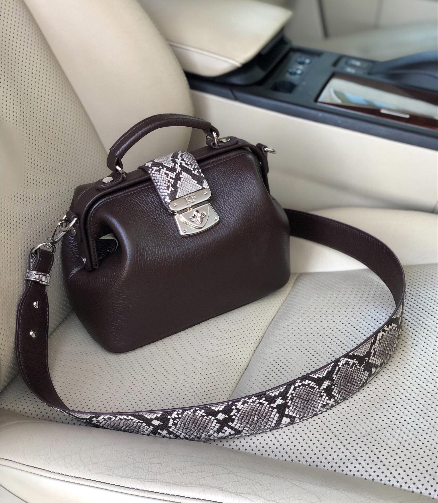 Women's leather bag made of genuine leather, hardware with galvanic coating and microfiber lining. The internal space of a bag is equipped with three compartments, two compartments and two side pockets, one of them with a zipper. It closes with a lock and two magnet buttons. The bottom of the bag is protected with metal legs. There is a long handle that allows you to wear the bag on the shoulder. The kit also includes a storage bag.