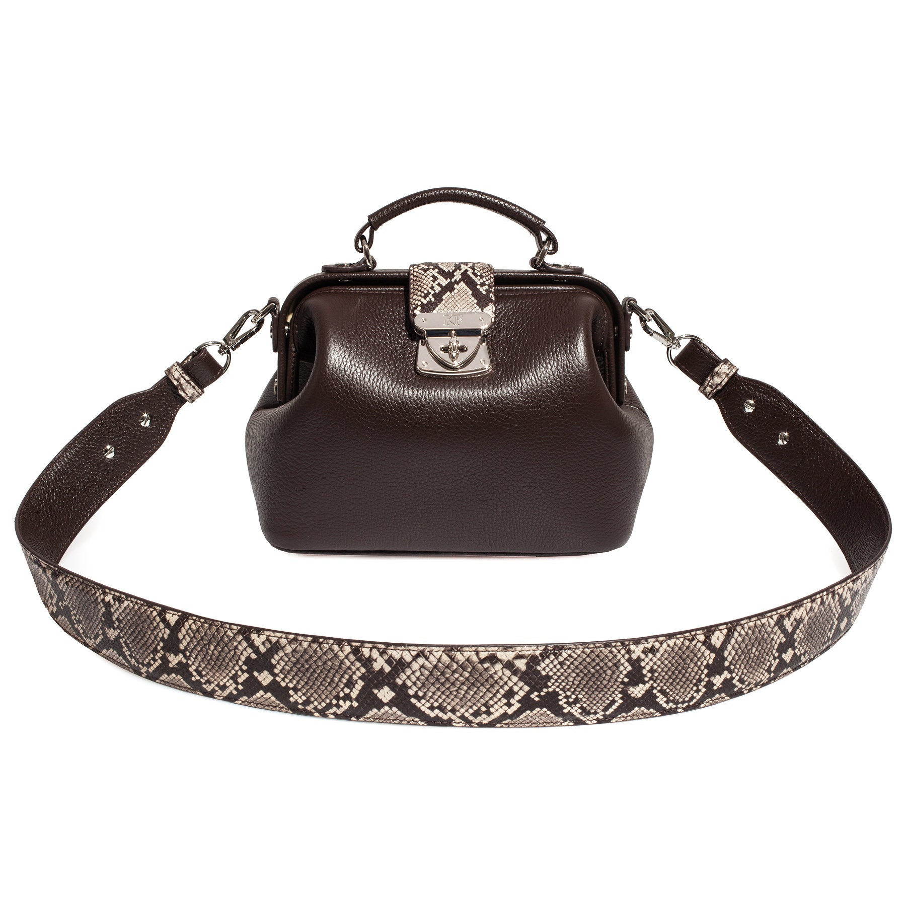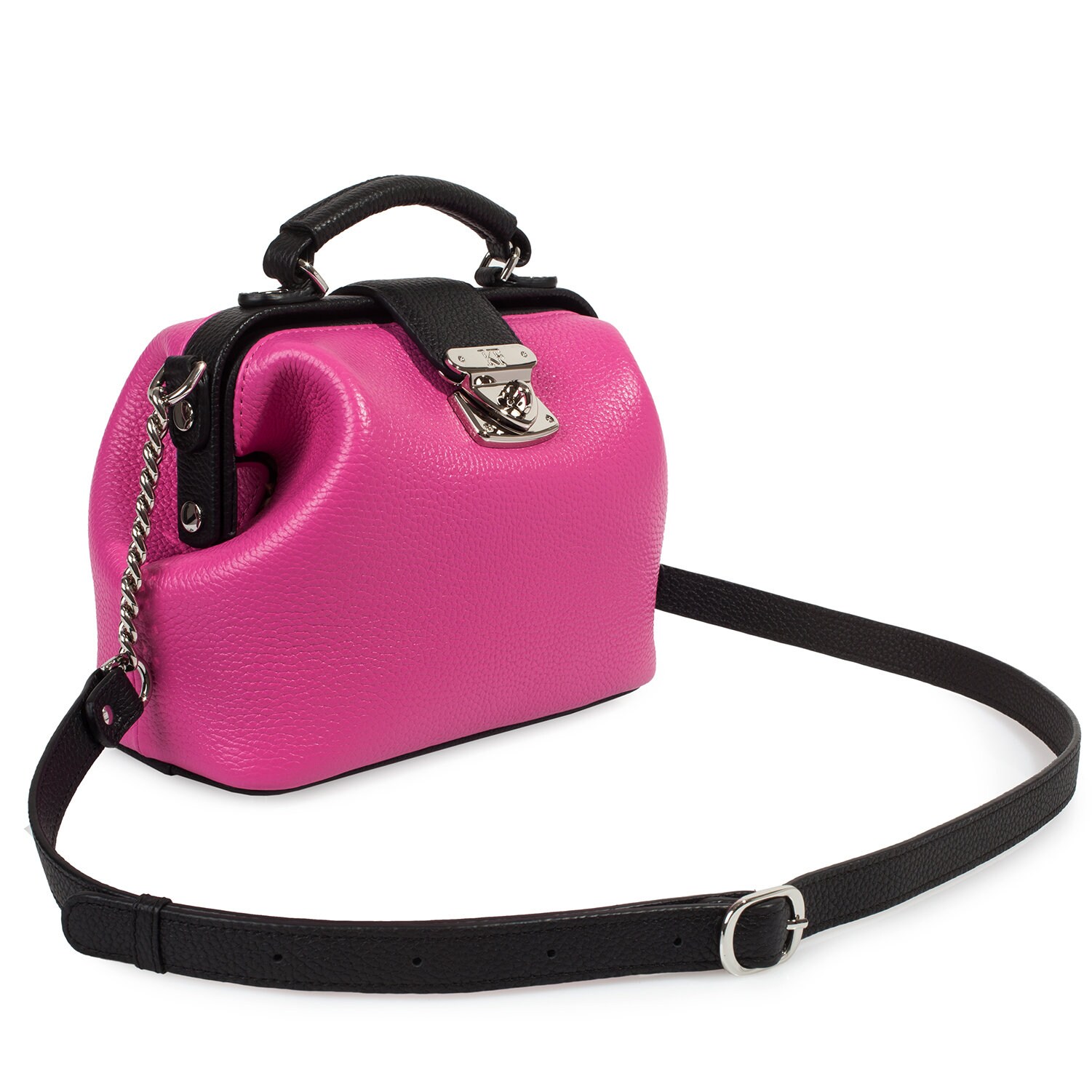 Women's leather bag made of genuine leather, hardware with galvanic coating and microfiber lining. The internal space of a bag is equipped with three compartments, two compartments and two side pockets, one of them with a zipper. It closes with a lock and two magnet buttons. The bottom of the bag is protected with metal legs. There is a long handle that allows you to wear the bag on the shoulder. The kit also includes a storage bag.