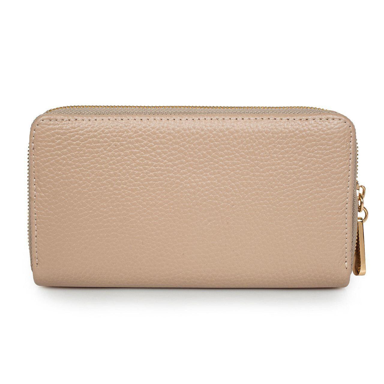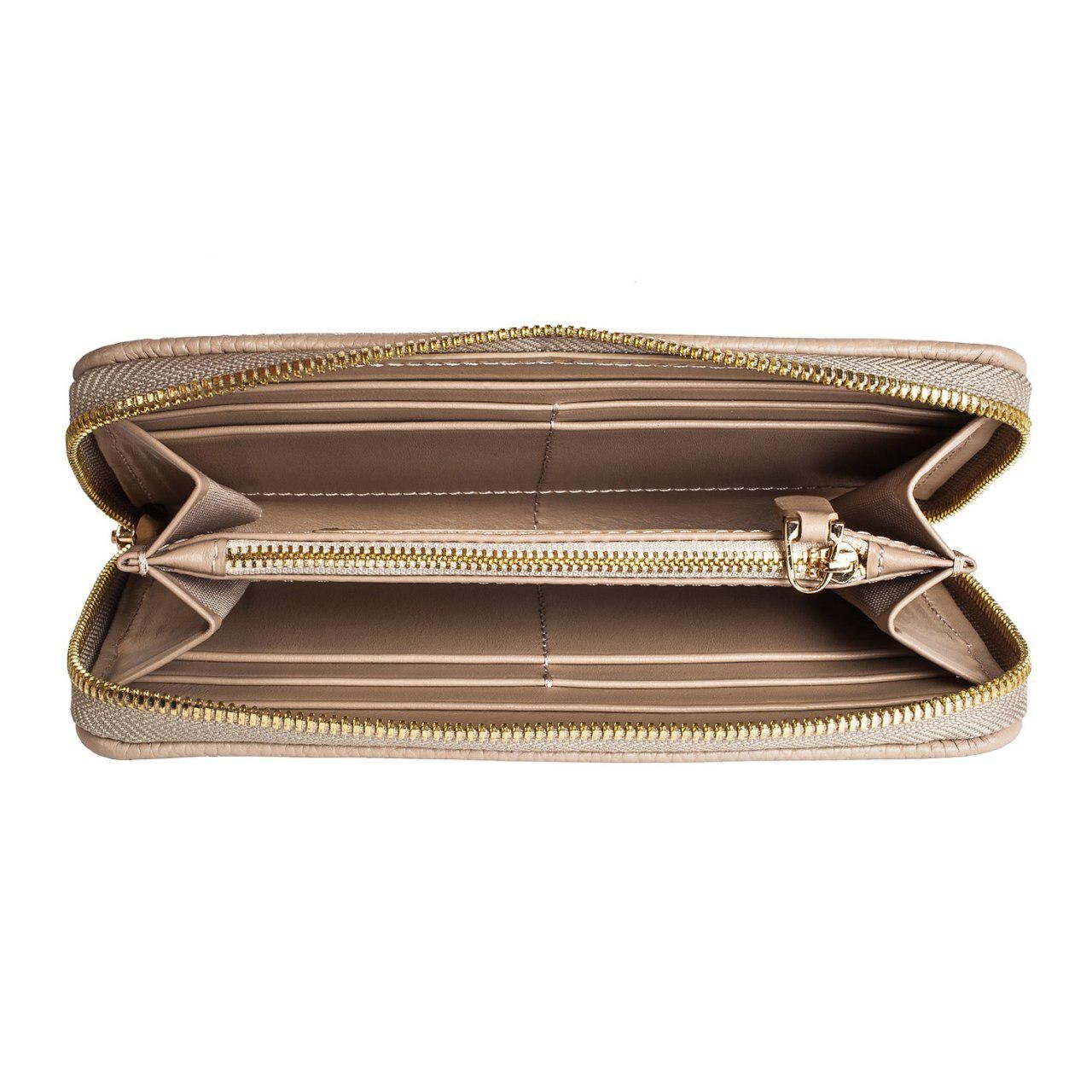 Beige genuine leather woman wallet from ukrainian designer Katerina Fox. A stylish accessory – a necessary purchase for many women. Wallet KF like women who value practicality and beauty. Inside two large compartments for notes, separating zipper pocket for coins, nine pockets for business cards and two department, closed wallet on zipper. Wallet has a short handle on a removable wrist.